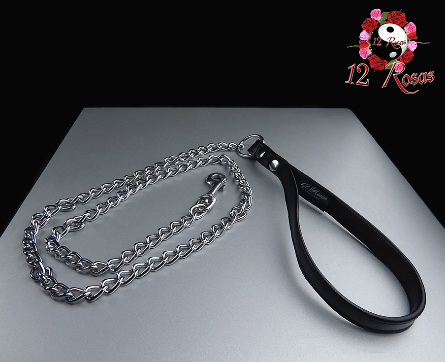 Vosotros decidís con esta cadena metálica terminada en carabina y lazo de agarre en piel de cuero negro (aprox. 20 cm de largo). Con un largo total 110 cm.