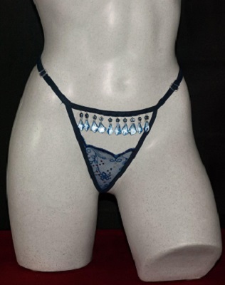 Su suave tul azul tapa lo justo para seducir a su pareja de juego, ademas de ir adornado en la parte superior de las tiras del mismo con adorno multiple de lagrimas azules de bisuteria.