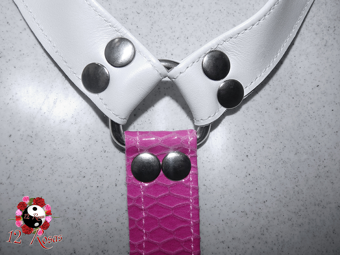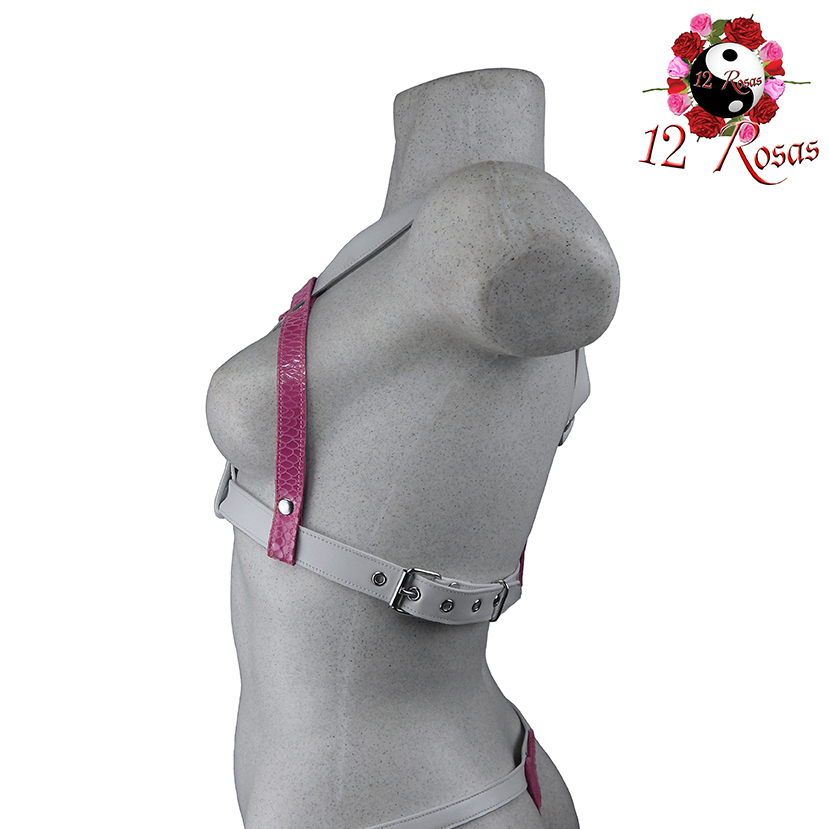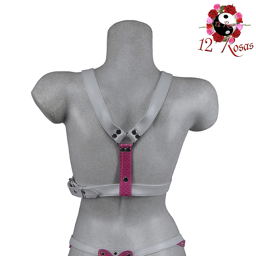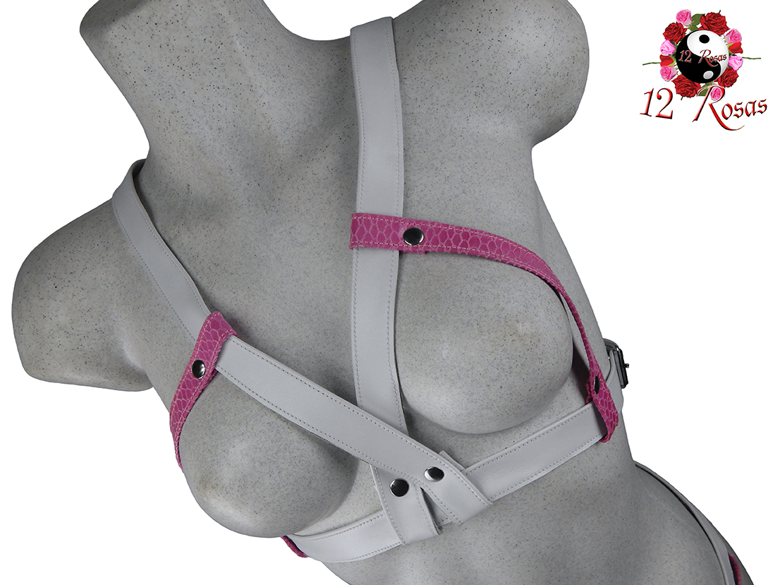 Fabricado en múltiples tiras de cuero simulando un sujetador, con los senos al aire, se ajusta